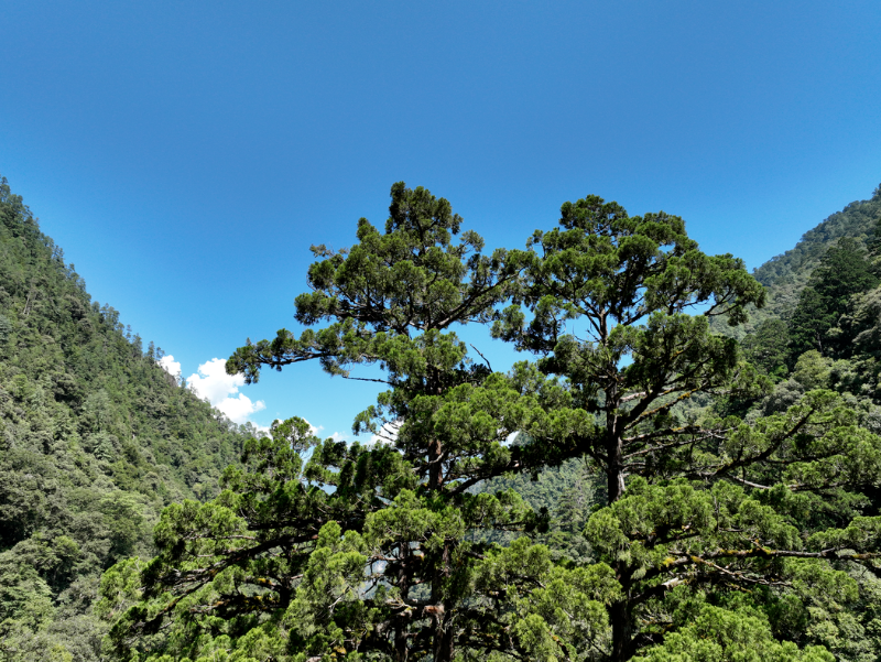 丙中洛的森林中蘊(yùn)藏著豐富的“自然寶藏”。全鎮(zhèn)共有古樹名木95株,其中貢山縣禿杉古樹群入選全國“雙百”古樹名錄,是丙中洛森林資源的瑰寶。位于甲生村的禿杉古樹群共850株,占地69畝,平均樹齡達(dá)350年,最高的一株達(dá)45米,需四人合抱方能圍攏。這片古樹群東至出渣口,西至山脊,南至嘎瓦格簿腳下,北至尼娃洛河,海拔介于1750至1850米之間,生境多樣,生物種類豐富,與云南松、油杉、紅豆杉等共生。林長制實(shí)施后,每株古樹都掛上了“身份牌”,標(biāo)注樹齡與保護(hù)等級(jí),旁設(shè)木質(zhì)觀景臺(tái),既便于游客觀賞,又避免踩踏根系。更特別的是,甲生村作為多民族聚居區(qū),村民世代秉持“萬物有靈、敬畏自然”的信念,將古樹群奉為“神山”“神樹”“神林”,嚴(yán)禁穿行、狩獵與放牧。這份源自民族的守護(hù),與管護(hù)站的專業(yè)管理形成合力,使古樹群歷經(jīng)數(shù)百年依然生機(jī)盎然。