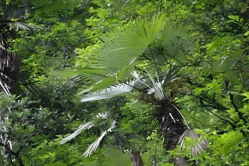 沿河谷分布的貢山棕櫚,則是林中的“靈動(dòng)風(fēng)景”。這一珍稀物種,是我國特有、云南極小種群保護(hù)植物,僅生長于海拔1550至1850米的懸崖峭壁上。樹高可達(dá)10米,葉片呈半圓至3/4圓形,整齊裂成45至48片硬直線形裂片,葉背覆有蠟白色,葉柄具雞冠狀突起。每年6至7月開花,8至10月結(jié)果,樹形優(yōu)美,用途多樣——葉鞘纖維用途廣泛,嫩花序可食,果實(shí)、葉、花、根皆可入藥。曾因生境破壞瀕臨滅絕,丙中洛管護(hù)站通過調(diào)查采集、種子擴(kuò)繁、常態(tài)化巡護(hù)及社區(qū)宣傳,動(dòng)員村民參與監(jiān)測保護(hù)。如今,在石門關(guān)“納一強(qiáng)”的崖壁上,貢山棕櫚依然迎風(fēng)搖曳,沐浴陽光,成為旅居者鏡頭中的“生態(tài)奇觀”。
