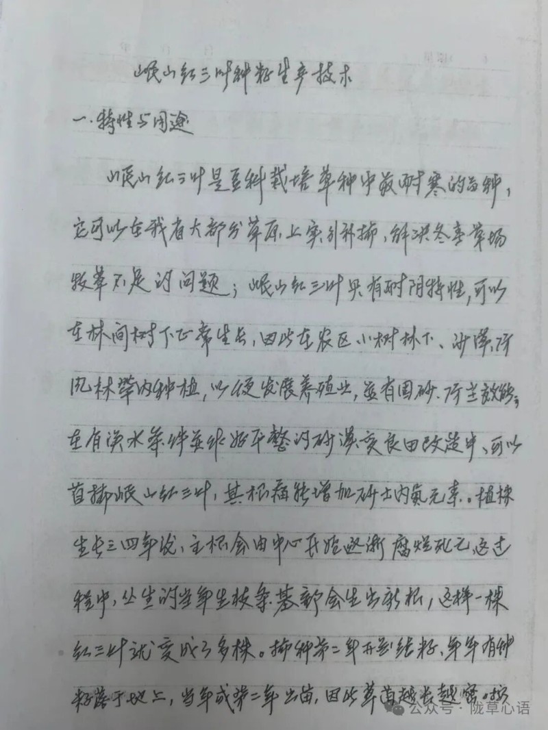 翻開這本一筆一劃,寫滿半生經(jīng)驗與牽掛的手稿,沒有華麗的辭藻,只有詳實的數(shù)據(jù)和一句句叮嚀。每一句都飽含著他對事業(yè)的熱愛之情與對單位發(fā)展的牽掛之心。從岷山紅三葉的特性與用途、原種基地建設(shè)條件,到繁種基地的選地、用籽、播種方法、套種和種籽增產(chǎn)操作要點,再到鋤草、收割以及運輸、抽檢等實操要領(lǐng),對岷山紅三葉草種生產(chǎn)的全過程進(jìn)行了系統(tǒng)性的總結(jié)與提煉,對每一個重要技術(shù)環(huán)節(jié)他都進(jìn)行了詳細(xì)的記述,甚至還標(biāo)注了自己曾經(jīng)遇到的問題及解決辦法。一頁頁密密麻麻的手寫稿,記錄著老人在多年實踐中總結(jié)的“獨門訣竅”,具有極高的實踐指導(dǎo)價值和科研參考意義。