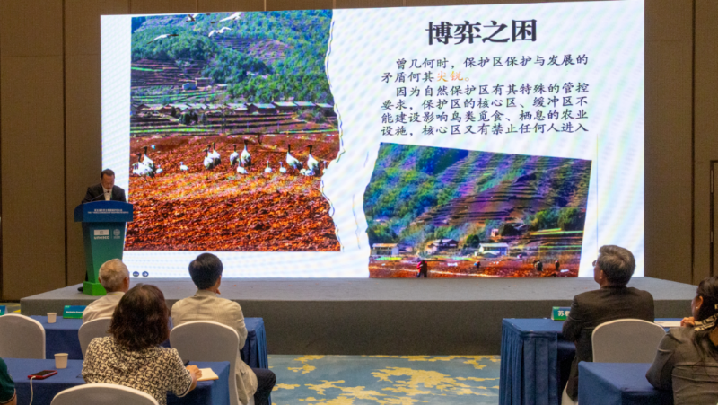 云南會(huì)澤黑頸鶴國家級自然保護(hù)區(qū)管護(hù)局黨組書記、局長肖良開分享了會(huì)澤黑頸鶴保護(hù)區(qū)社區(qū)協(xié)同發(fā)展的實(shí)踐經(jīng)驗(yàn)。會(huì)澤黑頸鶴保護(hù)區(qū)位于烏蒙山腹地,是黑頸鶴等珍稀鳥類的越冬地,曾面臨保護(hù)與發(fā)展的尖銳矛盾。肖良開介紹,保護(hù)區(qū)通過建設(shè)馬鈴薯種薯、燕麥種子、高原無公害蔬菜、中藥材等“四個(gè)萬畝基地”發(fā)展綠色經(jīng)濟(jì)帶動(dòng)社區(qū)增收,開展自然教育拓寬生態(tài)價(jià)值轉(zhuǎn)化路徑,建立公益科研監(jiān)測員制度補(bǔ)齊科研短板,創(chuàng)新“單元管控 清單管理”模式實(shí)現(xiàn)精準(zhǔn)保護(hù)。通過探索構(gòu)建“念湖樣板”,如今保護(hù)區(qū)保護(hù)成效顯著,鶴類數(shù)量從860只增至1647只,鳥類達(dá)229種,2024年國家生態(tài)環(huán)境部保護(hù)成效評估等級為“優(yōu)”,實(shí)現(xiàn)了人鶴和諧與鄉(xiāng)村振興的雙贏。