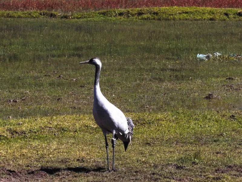 近日,管護局監(jiān)測到的首只攜帶追蹤器的灰鶴抵達拉市海越冬。(麗江融媒記者 趙鳳銘 攝)