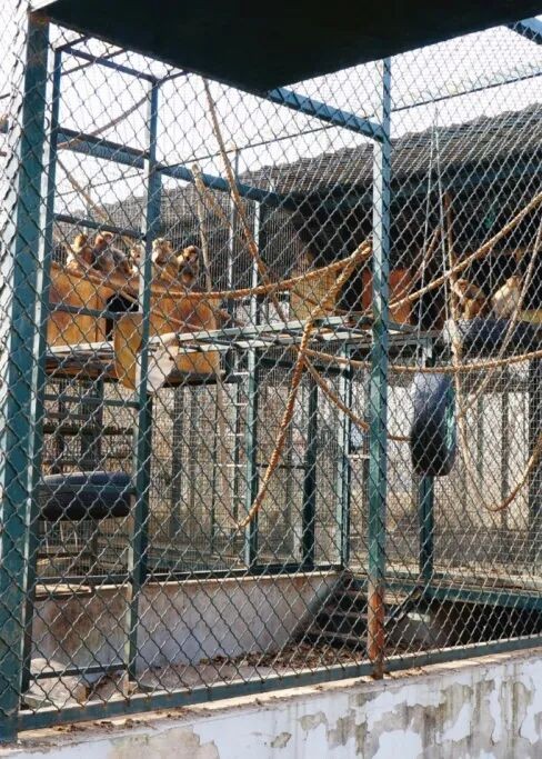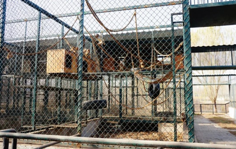 靈長類動(dòng)物是群居動(dòng)物,其康復(fù)籠舍的設(shè)計(jì)容量以每間20只左右、5kg以下的獼猴為宜,一般不宜放入過多的動(dòng)物?;\舍的布局通常采用雙排對(duì)開的布局,每側(cè)5間籠舍,籠舍間有串籠和通道?;\舍分為內(nèi)舍和外舍。內(nèi)舍做屋頂,外舍則不做屋頂,改用鐵網(wǎng)封閉以便采光,主要是便于內(nèi)舍避雨和動(dòng)物打架時(shí)可暫時(shí)躲避。南方通常內(nèi)、外舍不做或只做些小分隔,北方需做內(nèi)、外舍的分隔,以便內(nèi)舍加溫。外舍的頂部要設(shè)計(jì)成有斜坡的以便于篷布排水,內(nèi)舍向外舍部分的頂部逐漸降低并做好撐住篷布的鐵架,不能讓動(dòng)物摳到篷布。內(nèi)舍要保證室內(nèi)溫度在17℃以上,對(duì)于原分布地在熱帶和亞熱帶的靈長類動(dòng)物來說耐熱不耐寒,尤其是沒有經(jīng)過低溫鍛煉的靈長類動(dòng)物在氣溫低于20℃時(shí)極易感冒,氣溫低于13℃時(shí)幾乎會(huì)全部感冒,氣溫低于10℃時(shí)就會(huì)有生命危險(xiǎn)。需要特別注意的是,加溫設(shè)施必須非常堅(jiān)固,以動(dòng)物不能破壞為準(zhǔn)。外舍要有足夠的可見光面積,可以滿足上午陽光直射,使動(dòng)物能得到盡量多的光照。由于靈長類動(dòng)物多是樹棲動(dòng)物,不耐潮濕,因此要在內(nèi)、外舍架設(shè)棲息架。群居的靈長類動(dòng)物可以一個(gè)挨一個(gè)在棲息架上取暖,因此棲息架長度至少5m。籠舍通常要架設(shè)鐵質(zhì)底網(wǎng),底網(wǎng)離地面高度在60 ~ 80cm。底網(wǎng)必須有足夠的強(qiáng)度,至少可以滿足3個(gè)飼養(yǎng)員同時(shí)在底網(wǎng)上作業(yè)。籠舍地面用混凝土做成內(nèi)高外低、高差20cm的斜面,以便于用高壓水槍沖洗?;\舍最高的頂離底網(wǎng)高度不能超過2.5m,最低的頂離底網(wǎng)高度不低于1.5m,以便于捕捉動(dòng)物?;\舍的規(guī)格通常是寬3m,長7m。其中,內(nèi)舍長3m,外舍長4m。在外舍安裝自動(dòng)飲水設(shè)施,配備兩只猴子都搬不動(dòng)的重食槽,通??捎秘i用鐵食槽。猴房外兩側(cè)做排污溝。為了減少外界對(duì)動(dòng)物的影響,通常用磚砌封閉外墻或栽種植物遮擋視線。