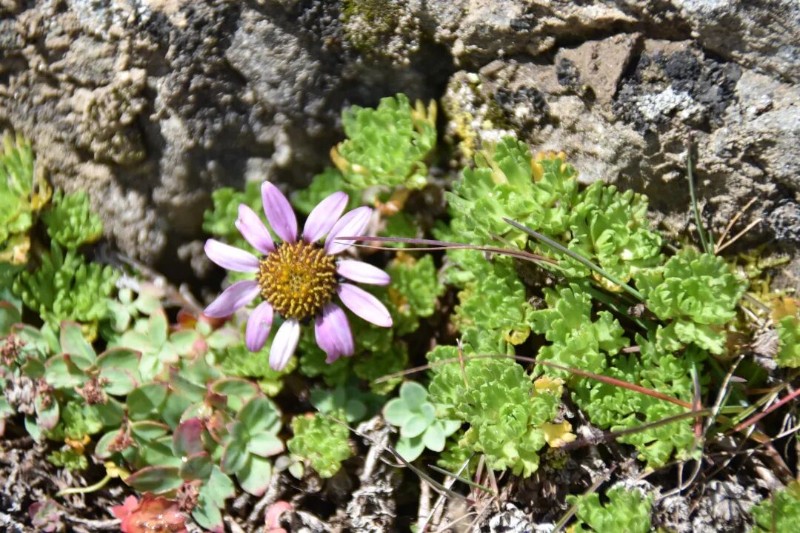 扁芒菊屬為菊科植物,是一個(gè)約有8—9個(gè)物種的小屬,分布于喜馬拉雅山區(qū)至亞洲中部。在我國(guó),該屬植物僅發(fā)現(xiàn)于西藏和新疆,生長(zhǎng)于流石灘和冰磧巖隙,海拔在4500米以上。本次調(diào)查發(fā)現(xiàn)的扁芒菊屬植物為毛果扁芒菊,在德欽縣人字雪山和阿東雪山有兩個(gè)分布點(diǎn),生長(zhǎng)于海拔4700—4900米的高山地帶的巖縫。