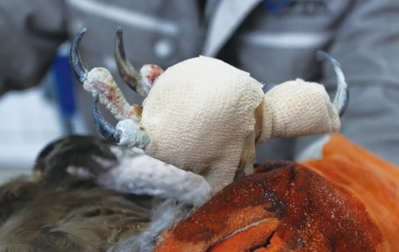 密切觀察繃帶,確保所包扎組織的健康(無腫脹、磨損)。通常猛禽身體包扎會導(dǎo)致膝關(guān)節(jié)或龍骨突損傷。腿部夾板或繃帶固定時,要密切觀察爪部,避免發(fā)生腳墊病。應(yīng)包扎雙爪,且在腳底部加墊棉花。