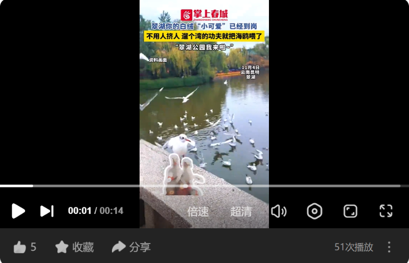 嘎嘎~你的白絨“小可愛”已經(jīng)到崗,不用人擠人遛個灣的功夫就把海鷗喂了~“翠湖公園我來啦~”