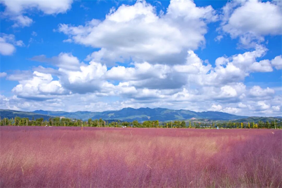 秋風(fēng)不僅染紅了水杉,更拂醒了星云湖畔的粉黛亂子草。蓬松的花穗綴滿枝頭,連片延展如粉色云霧,微風(fēng)過處,似有粉浪輕涌,空氣中彌漫著浪漫氣息。沿著觀光小徑漫步,置身于粉紅花霧間,抬眼可望見湖面粼粼波光,耳畔是田間蟲鳴,江川的田園詩意盡在其中。
