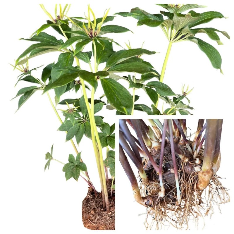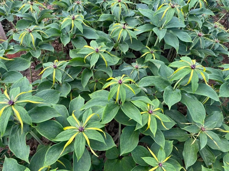 多莖。株高0.60─0.82米,莖稈基部離地0.10米以下為淡紫色,上部為綠色。葉卵狀矩圓形?;ò挈S綠色,寬披針形,與萼片近等長(zhǎng)。種植3年(成熟可采挖)平均畝產(chǎn)鮮藥材1403千克,重樓皂苷I、重樓皂苷II和重樓皂苷Ⅶ的總量為2.41%。