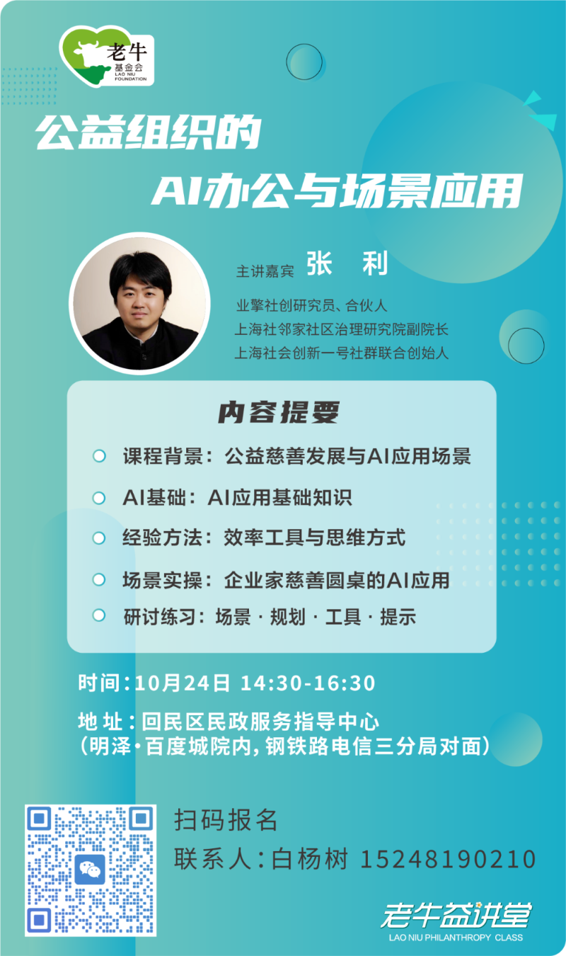 第32期老牛益講堂將于10月24日下午在呼和浩特市回民區(qū)民政指導(dǎo)中心(一樓會議室)舉辦,本期主題為“公益組織的AI辦公與場景應(yīng)用——效率工具 · 思維方式 · 現(xiàn)實場景”。特邀業(yè)擎社創(chuàng)研究員、合伙人,上海社鄰家社區(qū)治理研究院副院長,上海社會創(chuàng)新一號社群聯(lián)合創(chuàng)始人張利主講。