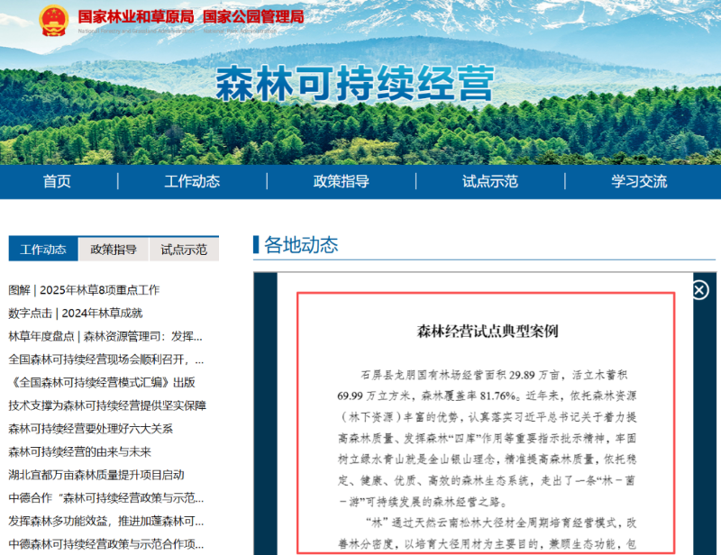 近日,從國家林業(yè)和草原局傳來一則喜訊——石屏縣龍朋國有林場森林經(jīng)營典型案例,成功被國家林草局官方網(wǎng)站收錄采用,并在“森林可持續(xù)經(jīng)營”專題展示推廣。