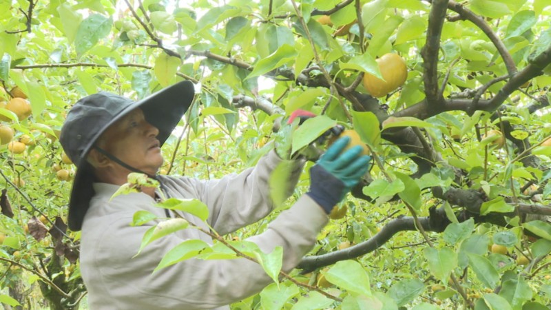 這片“黃金梨園”的帶頭人,是68歲的退伍老兵蘇自元。30年前,退伍回鄉(xiāng)的他歷經(jīng)打工、從事建筑工程等創(chuàng)業(yè)摸索后,毅然決定扎根臥佛村,承包荒山發(fā)展黃梨種植產(chǎn)業(yè)?!爱?dāng)時,我一位云南農(nóng)大的親戚來看過這片山后,建議可以種植梨,并推薦了大理州晚熟品種‘麥地灣’黃梨?!碧K自元回憶道。