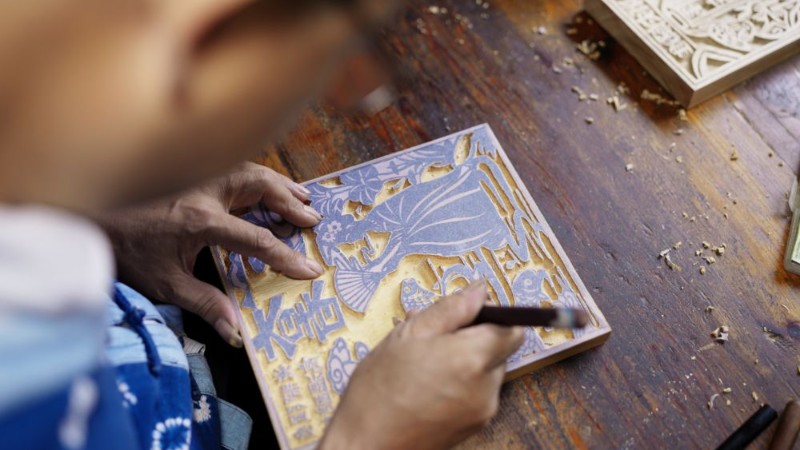7月5日,喜洲匠志集民藝中心甲馬版畫藝術(shù)館內(nèi),工匠正在雕刻甲馬。新華社發(fā)(羅曉川 攝)