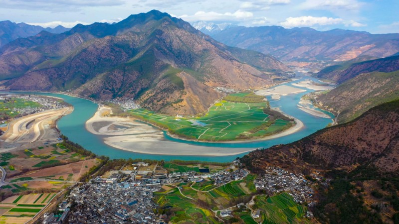 長江從青藏高原奔流而下,與瀾滄江、怒江并肩在橫斷山脈中穿行,到玉龍納西族自治縣石鼓鎮(zhèn)時突然轉(zhuǎn)向,形成罕見的“V”字形河道,這便是“長江第一灣”。