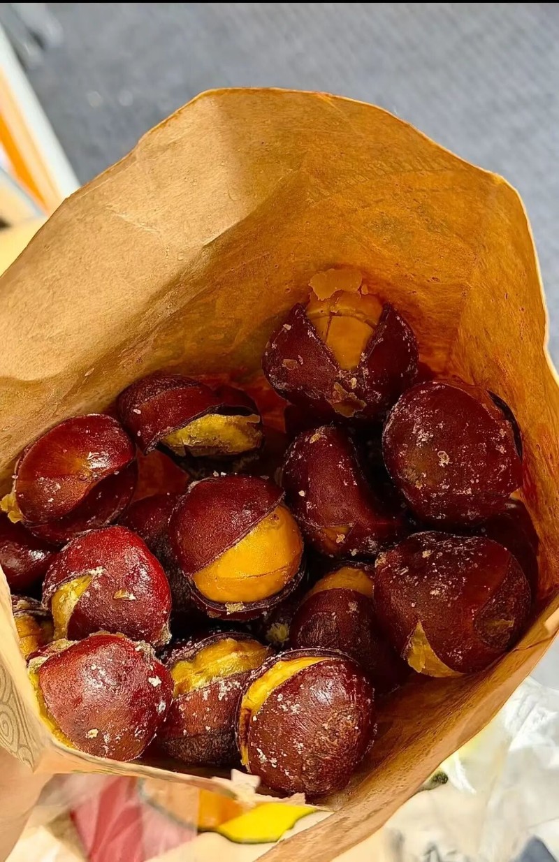 空氣中飄散著焦糖與栗子混合的甜香。剛出鍋的栗子盛在牛皮紙袋里,熱乎乎地燙手。剝開一顆,金黃的果肉粉糯甘甜,暖意從指尖一直傳到心里。