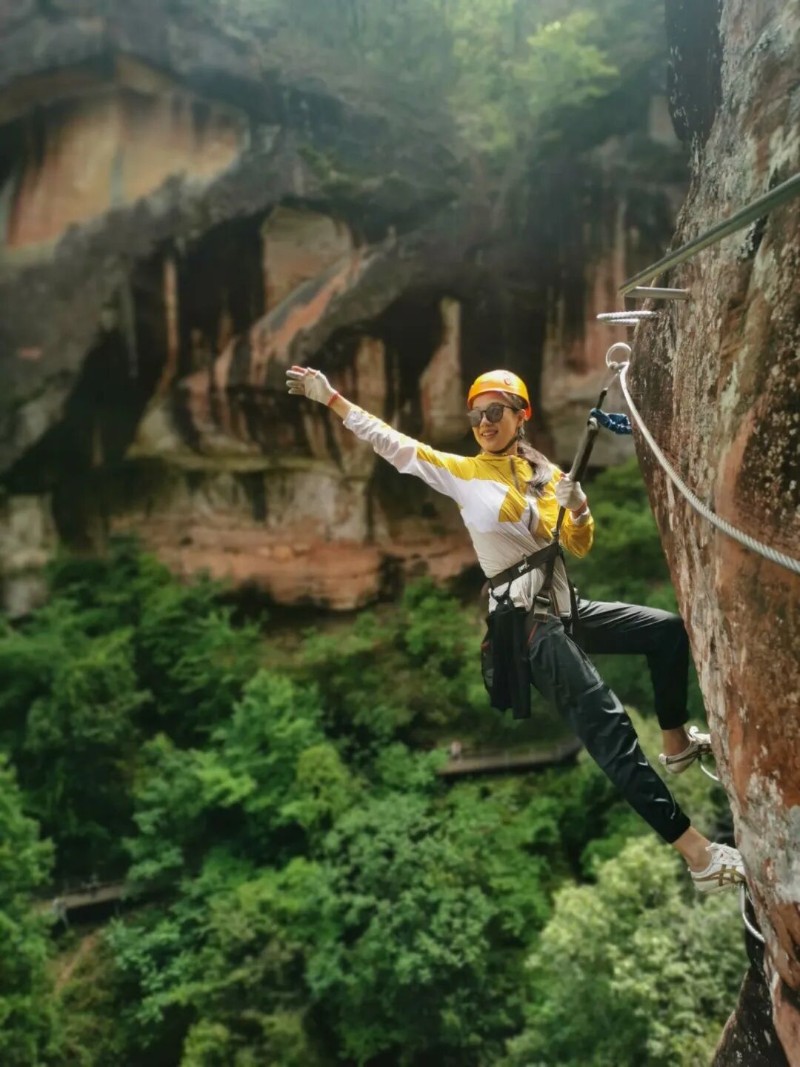 攀巖愛好者在黎明老君山丹霞巖壁上。(供圖)