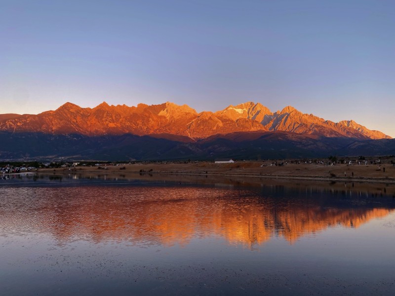 作為可遇不可求的自然勝景,玉龍雪山“日照金山”在秋末冬初的晴朗清晨更易顯現(xiàn)。清晨時分,當(dāng)?shù)谝豢|陽光突破天際,紅橙色的光穿透大氣層灑向扇子陡峰頂,隨后逐步蔓延至玉龍十三峰,原本銀白的雪峰瞬間被鍍上耀眼金光,宛如披上金色外衣,整個奇觀雖僅持續(xù)10至20分鐘,卻讓目擊者心靈震撼。
