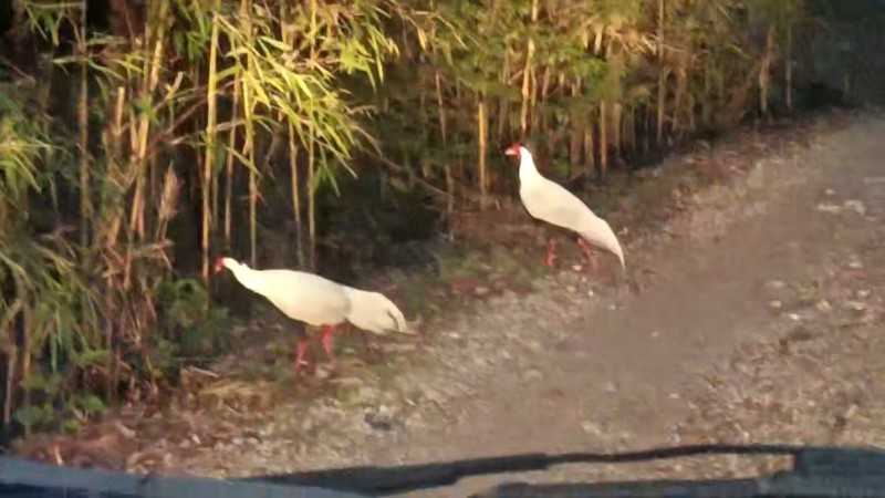 據(jù)監(jiān)測員介紹,當(dāng)天在完成野外監(jiān)測任務(wù)返回生態(tài)站的途中,只見兩只雄性白鷴悠閑地在公路邊覓食。