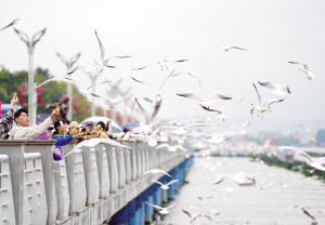 圖為11月2日,游客在海埂大壩觀鷗、喂食。
