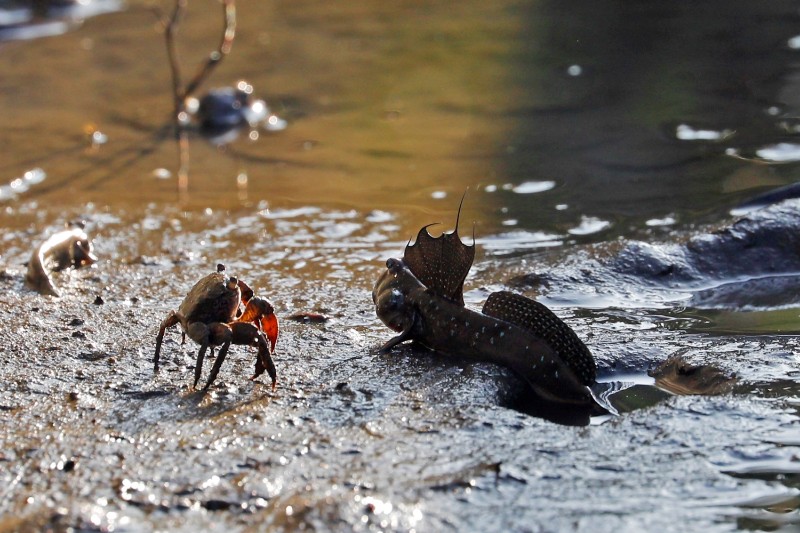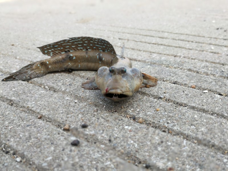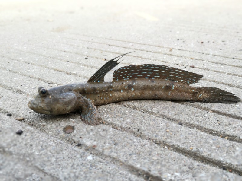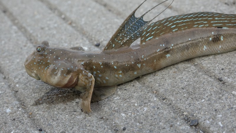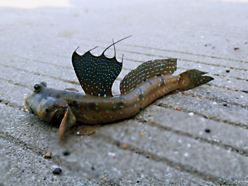 彈涂魚,它們以獨(dú)特的陸上行走能力和充滿活力的性格聞名于世。我們把剛抓上來(lái)的彈涂魚放在干燥的水泥板上,彈涂魚先用胸鰭踏在地上,當(dāng)胸鰭向前運(yùn)動(dòng)時(shí),腹鰭起著支撐身體的作用,擺動(dòng)尾鰭,豎起背鰭不斷扭動(dòng)身體向前行走。彈涂魚兩只眼睛凸出體外并且各司其職,一只探索食物,一只勘探敵情。成年彈涂魚通常體長(zhǎng)不超過(guò)20厘米,體表覆蓋有黏液,有助于在濕潤(rùn)環(huán)境下移動(dòng)時(shí)減少摩擦。
