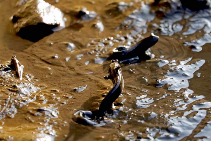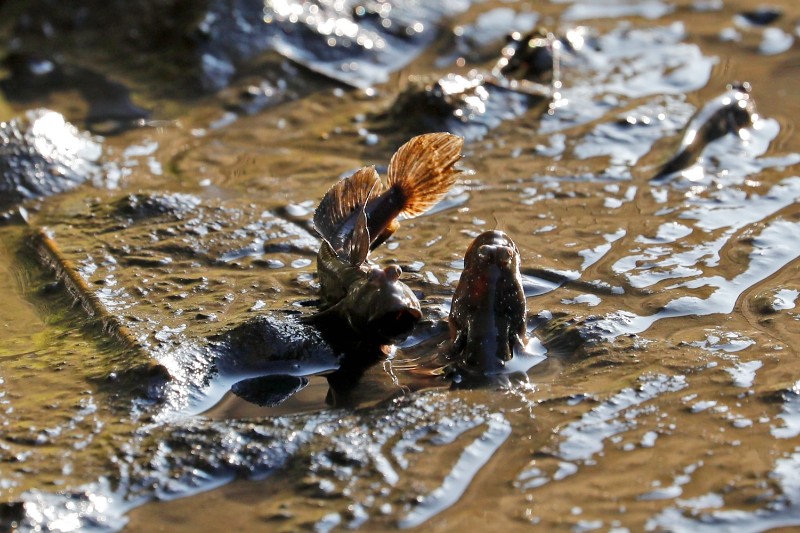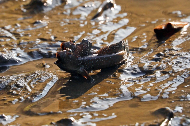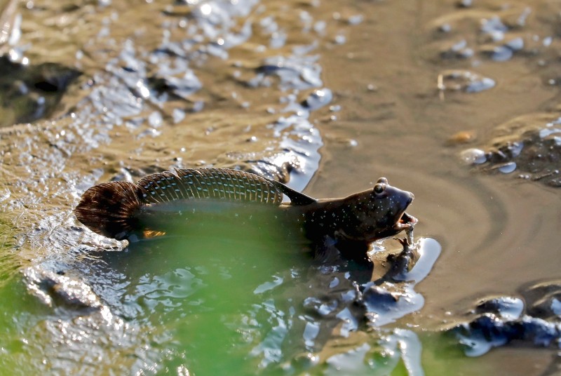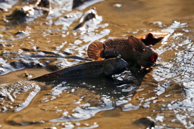 彈涂魚強(qiáng)壯的胸鰭和腹部肌肉允許它們?cè)诔毕巳r(shí),在海灘上“蹦跶”,尋找食物或者逃避天敵,或追逐同類。此外,它們還能夠通過(guò)皮膚和口腔吸收氧氣,這意味著即使離開水面,也能存活一段時(shí)間,這種能力使彈涂魚在干涸時(shí)不會(huì)立刻窒息。
