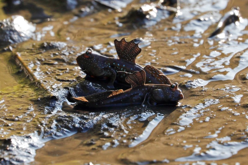 每年5—8月是雌彈涂魚繁殖季節(jié),雄彈涂魚就會(huì)向雌彈涂魚表演舞蹈以表達(dá)自己的愛情。它們鼓起鰓,弓起背,支起尾鰭,扭動(dòng)身軀,做出各種展示行為,如快速跳躍、顏色變化等。當(dāng)雌彈涂魚被其魅力傾倒,向其靠近時(shí),雄魚會(huì)繼續(xù)用表演的方式引其入自己的洞穴,并進(jìn)行交配。這種獨(dú)特的求偶過(guò)程,充分展示了彈涂魚復(fù)雜的社會(huì)行為和溝通能力。