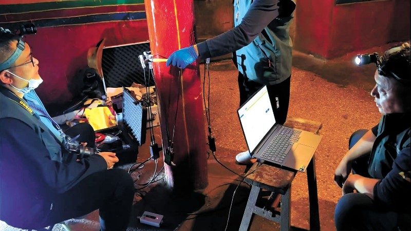 此次扎什倫布寺調(diào)查以拉讓殿為核心,聚焦大木構(gòu)件材質(zhì)現(xiàn)狀及病害成因。調(diào)查隊員排查發(fā)現(xiàn),地壟、一層、二層核心木構(gòu)件普遍存在蟲害問題,部分關(guān)鍵構(gòu)件蟲蛀損傷嚴重。團隊成員對蟲害部位進行精確尺寸測量、影像留存,并采集害蟲用于蟲種鑒定。同時對明顯蟲蛀構(gòu)件開展內(nèi)部無損檢測,摸清內(nèi)部空洞和侵蝕深度。除蟲害外,因樓面下沉導(dǎo)致的木構(gòu)件結(jié)構(gòu)問題同樣突出。木柱、短弓木、長弓木以及木梁等構(gòu)件存在不同程度開裂和歪閃。團隊已完整記錄裂紋的寬度、深度和長度及構(gòu)件歪閃方向與角度,這些數(shù)據(jù)將成為評估構(gòu)件承載性能、保障結(jié)構(gòu)安全的核心依據(jù)。