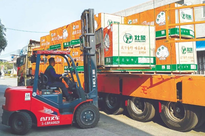 2025年1月,在廣西壯象木業(yè)有限公司,工人正在裝卸香杉板材(羅潔芳 攝)
