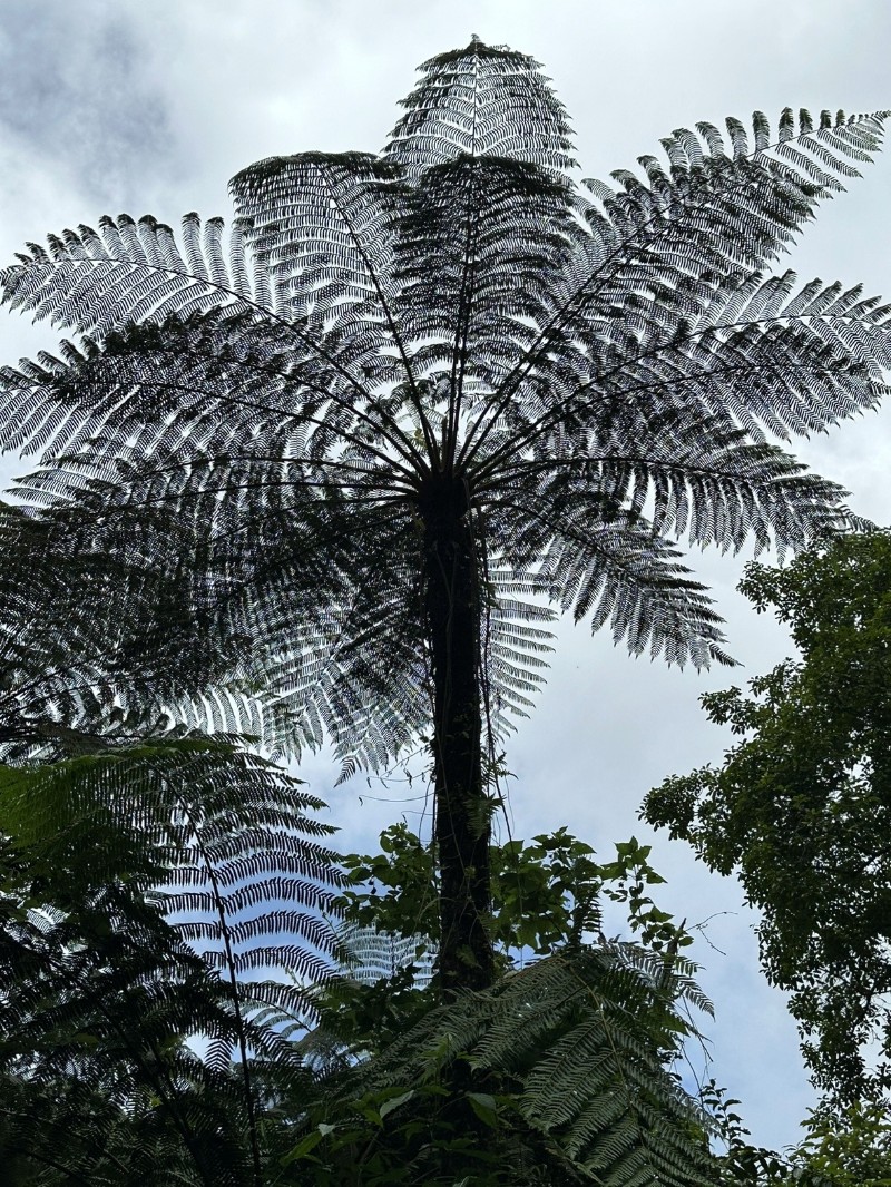 經(jīng)過三四個小時的跋涉,我們終于到了保護區(qū)。保護區(qū)仍保持著原始的生態(tài)環(huán)境,參天的大樹遮天蔽日,當頂?shù)奶柾高^樹葉灑下斑駁的光影。林中青藤蔓繞、蔥郁滴翠、清溪長流、蟲鳴鳥啼,生機勃勃。連片的中華桫欏佇立在茂密的森林中,我仰望這神往已久、在地球上存在了二三億年、曾當過“國禮”的神樹,它的外貌具有古老蕨類的原始感與木本植物的挺拔之美。作為大型木本蕨類植物,最引人注目的是其高大的莖干——高達10多米,直徑15—50厘米,宛如一根粗壯的棕色立柱,撐起龐大的羽狀樹冠,冠幅可達50多平方米,葉片長約2—3米,寬約1—1.5米,形如巨傘,狀若華蓋,亭亭玉立,自帶一種蒼勁的古樸氣質(zhì)??拷鼧渖恚瑥南孪蛏涎鐾?,寬大的羽狀葉片就像鏤空的剪紙畫,充滿俊秀飄逸的美感。站在桫欏林中,我仿佛穿越到了侏羅紀,密林深處好像有巨大的恐龍正在窺視著我,隱約聽見如滾雷般的吼聲。當萬籟俱寂、皓月當空,月光如水銀瀉地灑在桫欏樹枝上,這里會是怎樣一種寂寥沉靜的史前世界的景象。撫摸著中華桫欏粗糙長滿氣生根的樹干,遙想五十多年前,它作為使者,遠渡重洋,給彼岸帶去古老的東方大國的問候。