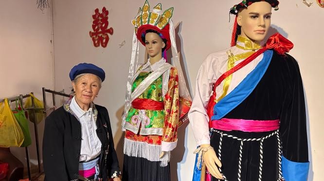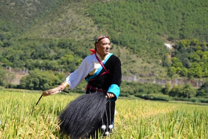 暮色如金。81歲老人和萬春坐在廊下,蒼老的手指捻動毛線。光暈在彩色衣袂間跳躍:女兒藏裝圍腰系得規(guī)矩,是母親教的;孫子傈僳坎肩披得隨意,透著少年氣。白族兒媳端著酥油茶走來,壺柄上的溫度,順著目光遞到廊下老人的手邊。
