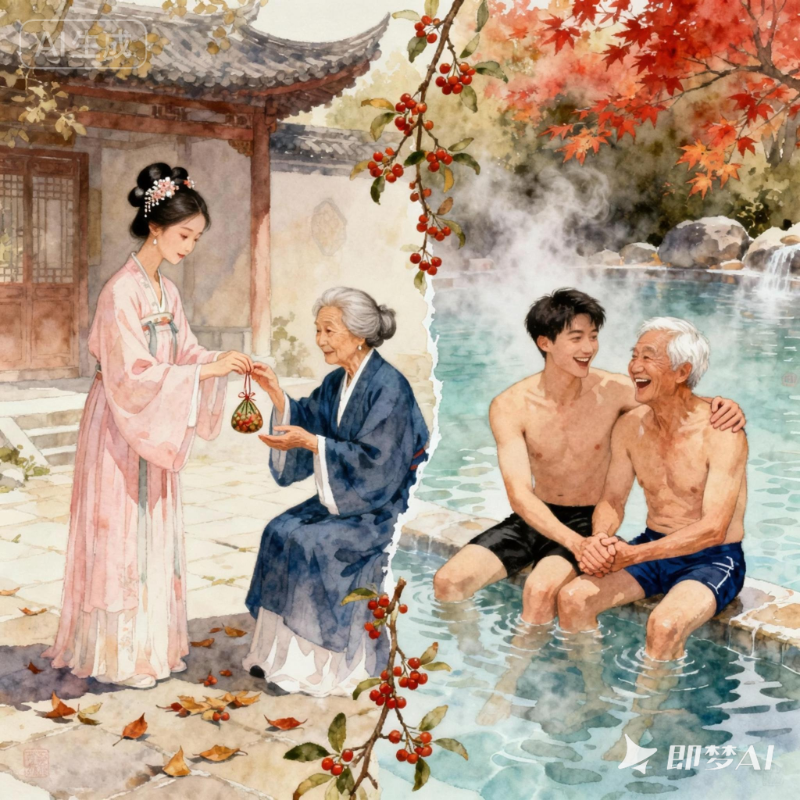 陪伴他們浸入這一片氤氳,看溫?zé)岬乃鬏p撫過他們不再緊致的肌膚,蒸騰的霧氣柔和了他們臉上的皺紋。那份暖意,不疾不徐,仿佛能透過腠理,緩緩滲入關(guān)節(jié)深處,將歲月積淀的僵硬與酸疼,一點點化開。這與古人“佩茱萸以御初寒”的初心同出一轍,卻更為包容、更貼近身體——它以整個山川的溫度,將人溫柔包裹。