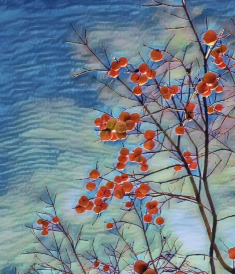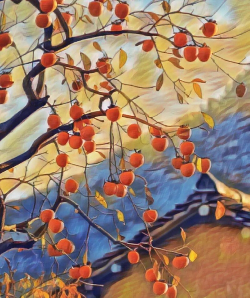 童年記憶中的柿子樹,褪去了所有浮華,顯露出本真風(fēng)骨。樹上葉子幾乎落盡了,干干凈凈,毫不拖泥帶水。于是,那鐵灰色的枝干便全然裸露出來,一枝一杈,都像是用墨汁在秋日畫卷里奮力寫出的筆觸——那樣的虬曲蒼勁,帶著一種飽經(jīng)風(fēng)霜的、沉默的力量。而就在這縱橫交錯的、堅硬的線條之間,垂掛著數(shù)不清的“小燈籠”。它們是飽滿而豐盈的果實(shí),色彩也并不單調(diào),有羞怯的橙黃,有微醺的橘紅,更有那熟透了的、幾乎要滴下蜜來的深紅,它們沉沉地綴在枝頭,背景是那片被秋風(fēng)洗得格外高遠(yuǎn)的藍(lán)天,天空下,便是老屋那一片片鱗次櫛比的灰瓦與一堵素凈的白墻,院墻一角,是一幅渾然天成的國畫,整個秋天,我所有關(guān)于家的、溫情的、安寧的意象,都盡在其中了。