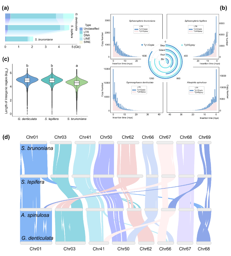 中國科學院華南植物園植物進化與保護研究團隊構(gòu)建了不同生態(tài)型 (典型喬木狀樹形及無顯著樹干的非樹形)桫欏科植物高質(zhì)量基因組圖譜,整合比較基因組學與轉(zhuǎn)錄組學, 深度解析了其基因組演化機制。結(jié)果發(fā)現(xiàn),在整體分子進化速率相對緩慢的背景下,整個樹蕨譜系僅在約1.54億年前共享一次全基因組復制(WGD)事件。該事件賦予了樹蕨雙重適應優(yōu)勢,不僅賦予了祖先樹蕨對侏羅紀晚期環(huán)境劇變的適應能力,也為后期物種多樣化提供了遺傳基礎(chǔ)。典型樹形物種優(yōu)先保留與細胞壁合成和木質(zhì)化相關(guān)的基因以強化支撐結(jié)構(gòu),而非樹形物種則更多保留代謝與防御相關(guān)基因以增強生存韌性。研究還發(fā)現(xiàn),轉(zhuǎn)座子元件的持續(xù)爆發(fā)驅(qū)動了基因組結(jié)構(gòu)動態(tài)變化,包括顯著的基因組大小變異和染色體重排,成為局部快速演化的核心驅(qū)動力。此外,喬木狀的表型創(chuàng)新并非簡單依賴于WGD滯留基因劑量,而更依賴于復雜的轉(zhuǎn)錄調(diào)控,該機制可能通過協(xié)同木質(zhì)素合成與光感知過程,進一步促進樹蕨在被子植物主導的林下環(huán)境中的適應。該研究將傳統(tǒng)認知的活化石植物“演化停滯”重新定義為一種基因組的動態(tài)平衡。宏觀進化遲緩背景下的基因組可塑性與局部創(chuàng)新,正是樹蕨成功跨越億萬年地質(zhì)變遷的演化密鑰。該成果不僅為桫欏科珍稀“活化石”蕨類植物的保護研究提供了重要的基因組資源,同時為理解古老孑遺植物的長期存續(xù)與演化提供了全新理論框架。