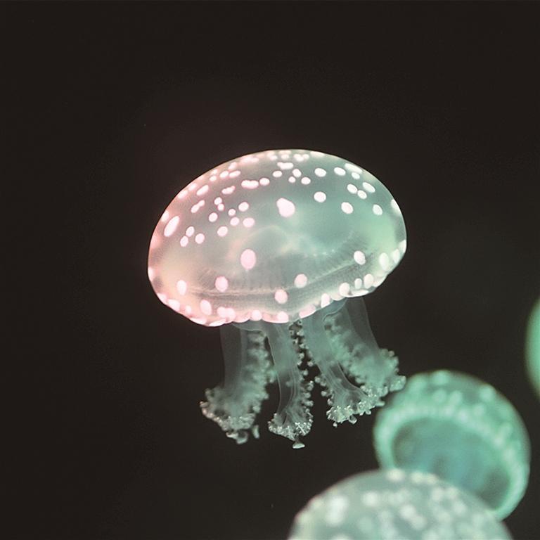 巴布亞硝水母 分布于太平洋、印度洋,水母體的傘呈半球狀,具有大小白色斑點(diǎn),傘緣形成淺淺的傘折,不具觸手。懸垂的口腕通常呈短棒狀。