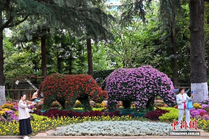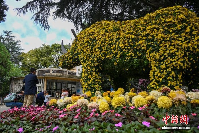 10月10日,云南昆明,菊花制作的大象造型吸引游客。中新社記者 李嘉嫻 攝