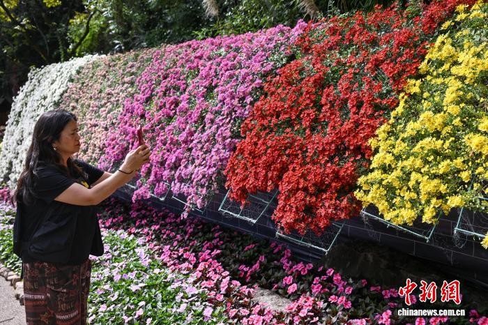 10月10日,云南昆明,“菊花瀑布”吸引游客拍照。中新社記者 李嘉嫻 攝