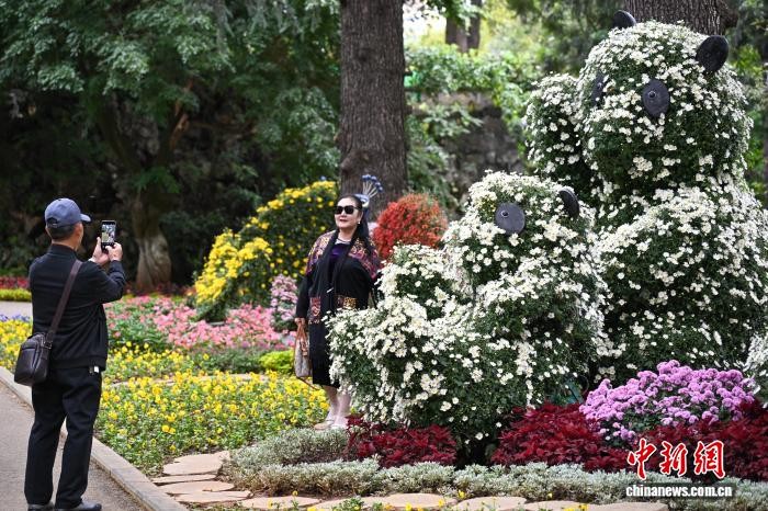 10月10日,云南昆明,菊花制作的大熊貓造型吸引游客拍照。中新社記者 李嘉嫻 攝