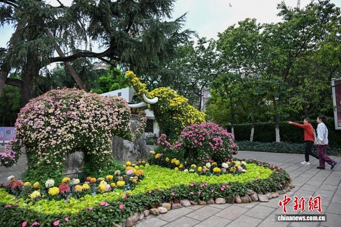 10月10日,云南昆明,游客在鮮花動物長廊拍照。近日,以“靈蛇筑夢·金秋圓通”為主題的2025年秋季菊花展在昆明動物園展出,近百種菊花融合動物萌寵造型、菊文化與園林藝術(shù),傳遞“人與自然和諧共生”理念。中新社記者 李嘉嫻 攝