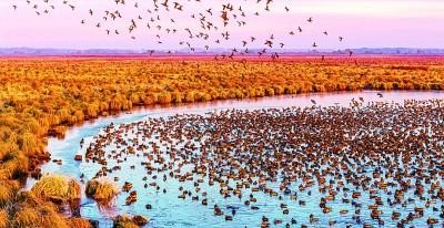黑龍江省撓力河國(guó)家級(jí)自然保護(hù)區(qū),候鳥(niǎo)在晨光中翔集。新華社發(fā)