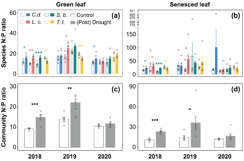 中國(guó)科學(xué)院沈陽(yáng)應(yīng)用生態(tài)研究所沙地和退化草地近自然恢復(fù)與多功能提升創(chuàng)新組群依托額爾古納森林草原過渡帶生態(tài)系統(tǒng)研究站極端干旱實(shí)驗(yàn)平臺(tái)系統(tǒng)分析了極端干旱期間以及干旱停止后兩年內(nèi)草甸草原植物氮磷比的變化規(guī)律。研究發(fā)現(xiàn),在經(jīng)受了4年的極端干旱處理后,植物群落中優(yōu)勢(shì)物種的氮含量顯著提高、磷含量降低、氮磷比顯著提高(圖1)。同時(shí),極端干旱導(dǎo)致具有較高氮磷比的禾草類植物在群落中的優(yōu)勢(shì)度增加,進(jìn)一步加劇了群落水平的氮磷失衡。在極端干旱處理停止兩年后,盡管植物群落的物種組成未完全恢復(fù)至初始狀態(tài),但群落氮磷比可恢復(fù)至正常水平。植物氮磷平衡的恢復(fù)主要?dú)w因于極端干旱停止后禾草的超補(bǔ)償生長(zhǎng)對(duì)土壤有效氮的消耗。以上研究結(jié)果明確了極端干旱引發(fā)的植物群落水平的氮磷失衡具有可逆性,并從群落物種組成的角度揭示了其內(nèi)在機(jī)理,為干旱區(qū)草地適應(yīng)性管理和預(yù)測(cè)全球變化下草地養(yǎng)分循環(huán)提供了理論依據(jù)。