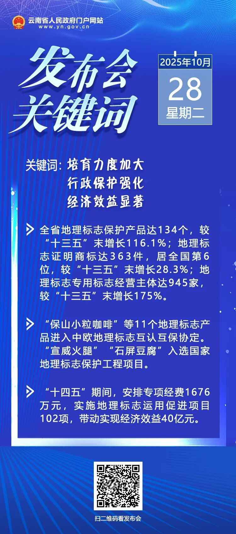 10月28日,云南省地理標志助力鄉(xiāng)村振興新聞發(fā)布會在云南海埂會堂召開,有關部門負責人通報近年來云南省地理標志工作助力鄉(xiāng)村振興的主要成效,并回答記者提問。