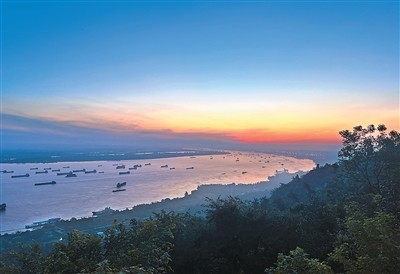 終于登頂,眼前豁然開朗。大家都有些氣喘吁吁,我身上出了一層細(xì)汗。山頂上,有一座建在臨江觀景臺(tái)上的方形亭子,亭上寫著“劍決浮云”四個(gè)大字,亭外樹木蔥蘢。走入亭中憑欄遠(yuǎn)眺,只見天已大亮,長江在山下蜿蜒奔流。滾滾東去的江面上,成百上千只船舶像模型般精巧。到了長江拐彎處,船舶仿佛也都傾斜了身子,想要輕捷地滑過江面。頭頂?shù)奶炜找黄野?,只有東邊水天相接處有橙色的一線。
