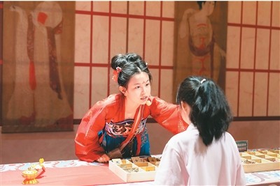| “露華濃深——大唐生活美學展”社教體驗區(qū),小講解員為參觀者貼花鈿。 |