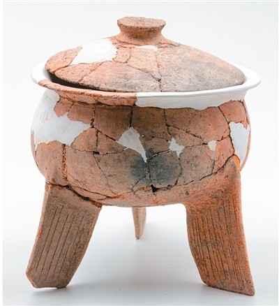 | 柘林遺址出土的良渚文化帶蓋陶鼎。 |