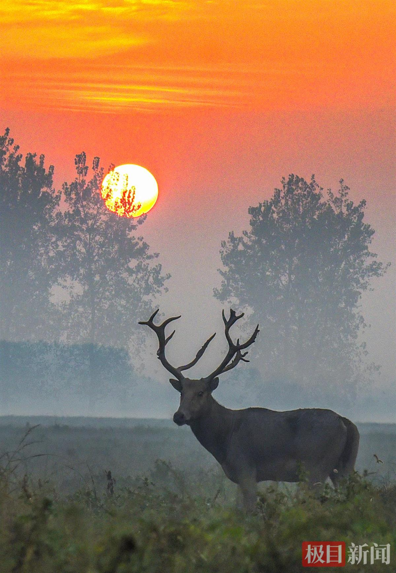 石首麋鹿國家級自然保護(hù)區(qū),一頭麋鹿在朝陽下覓食。(極目新聞?dòng)浾?nbsp;黃志剛 攝)