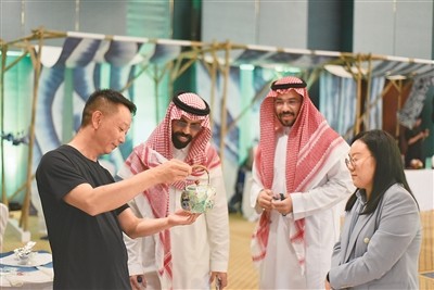 | 譚志平在展會(huì)上向外國參觀者展示產(chǎn)品“彩銀之藍(lán)”。 |