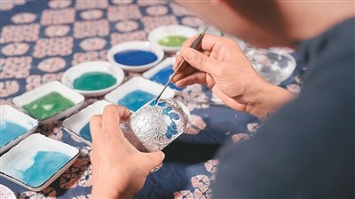 | 譚志平(右)在伯父譚繼成指導(dǎo)下為銀胎“填藍(lán)”。 |