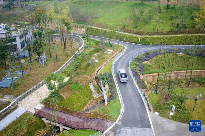 11月4日,在中國大熊貓保護研究中心綿陽基地,工作人員駕車轉(zhuǎn)運大熊貓入?。o人機照片)。新華社發(fā)