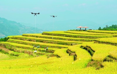 湖北秭歸縣沙鎮(zhèn)溪鎮(zhèn)長(zhǎng)春村村民用無人機(jī)轉(zhuǎn)運(yùn)收獲的水稻。新華社發(fā)