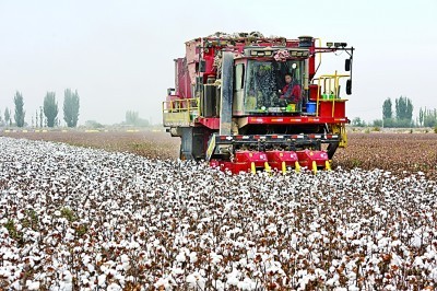 新疆阿瓦提縣,一臺(tái)大型采棉機(jī)在棉田里作業(yè)。新華社發(fā)