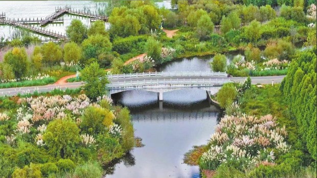 荻花與碧水、綠植構(gòu)成秋日美景。