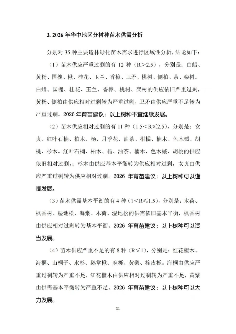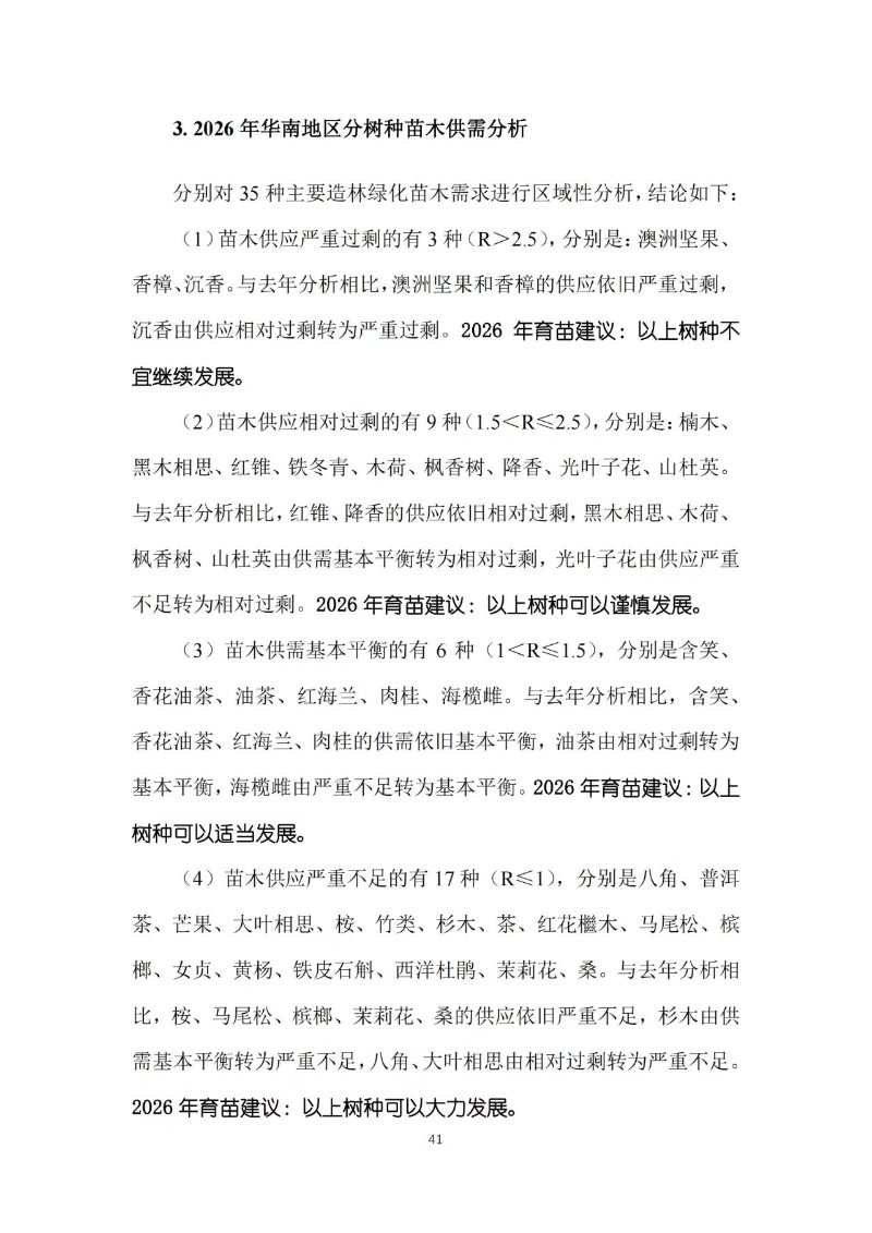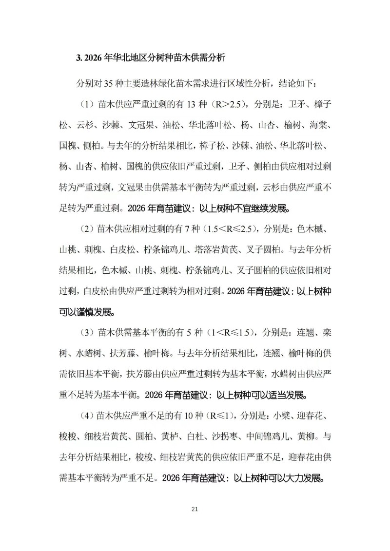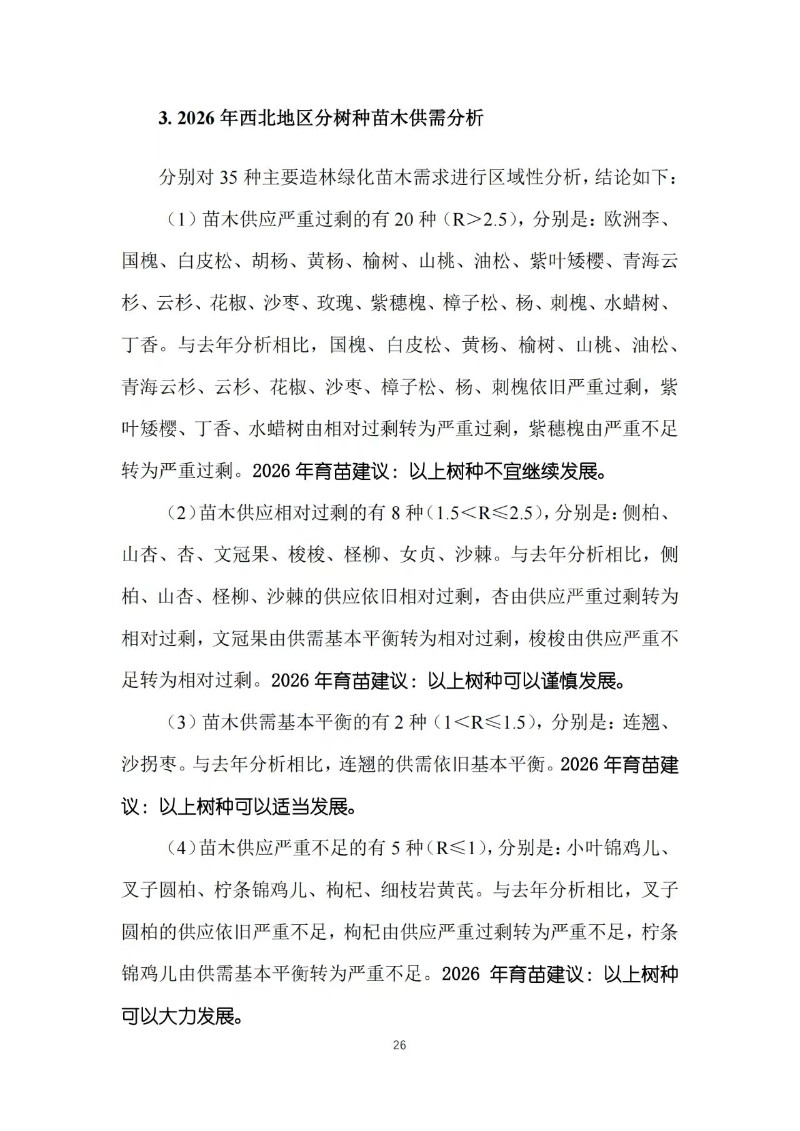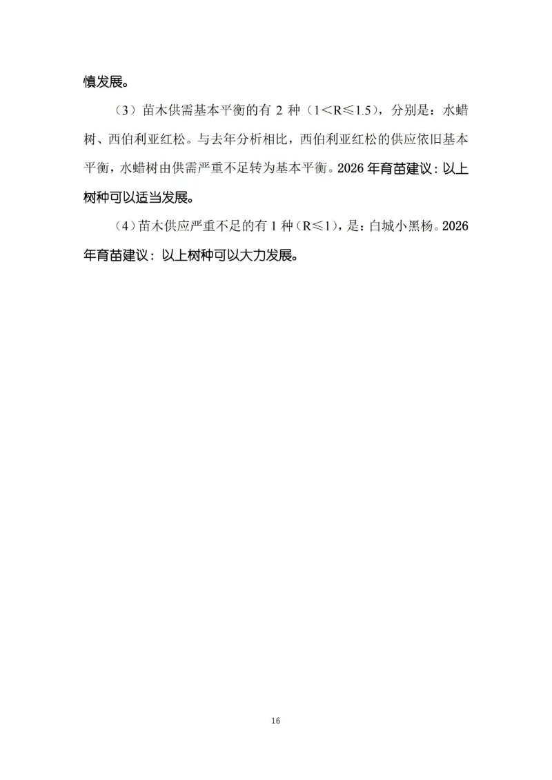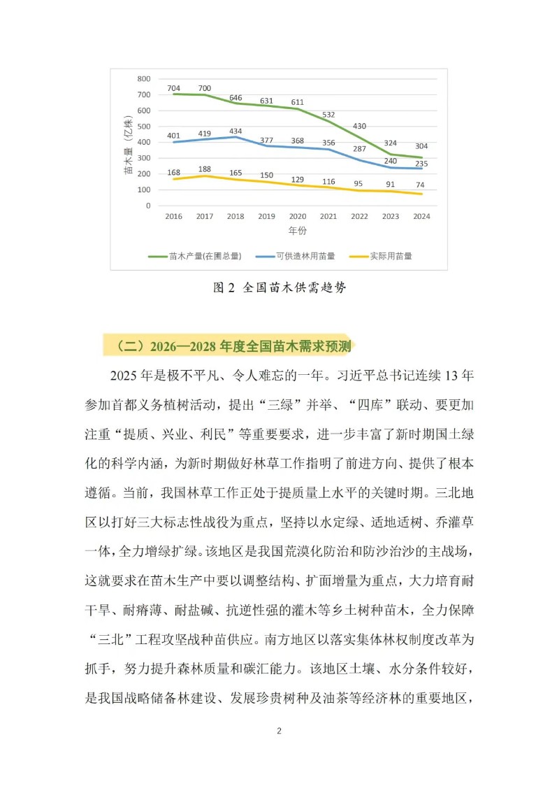 為有效緩解種苗供需結(jié)構(gòu)性矛盾,引導(dǎo)苗木生產(chǎn)經(jīng)營者合理安排生產(chǎn),推進(jìn)林草種苗事業(yè)高質(zhì)量發(fā)展,國家林業(yè)和草原局國有林場和種苗管理司組織北京林業(yè)大學(xué)、全國(合肥)苗木花卉交易信息中心和中國經(jīng)濟(jì)信息社,根據(jù)當(dāng)前我國國土綠化和生態(tài)保護(hù)修復(fù)的形勢與任務(wù)、以及種苗生產(chǎn)實(shí)際情況,對2026年全國苗木供需情況進(jìn)行了分析,編制完成了《2026年度全國苗木供需分析報告》,于11月1日正式發(fā)布。